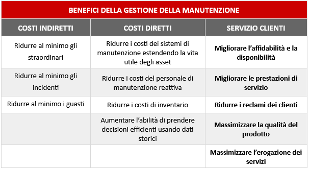La gestione della manutenzione contribuisce a migliorare l’efficienza operativa degli impianti, contribuendo al fatturato, riducendo i costi operativi e migliorando la qualità (e la quantità) dei prodotti realizzati. Oltre al risparmio sui costi, altri vantaggi includono una migliore sicurezza sul lavoro, una maggiore produttività e la riduzione dell’errore umano.