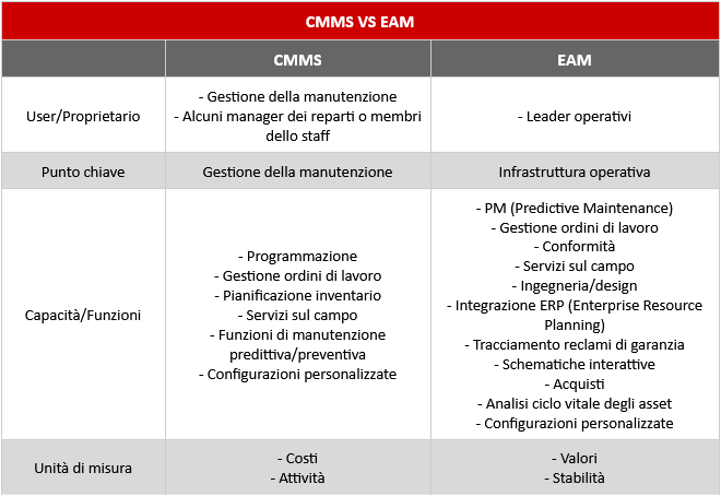 In passato, i sistemi CMMS e EAM (Enterprise Asset Management) erano considerati soluzioni molto diverse per la gestione della manutenzione. Da allora i sistemi moderni hanno offuscato i confini tra i due, con molti sistemi software che includono le capacità di entrambi in un unico pacchetto software aziendale. È importante notare, tuttavia, che non sono la stessa cosa.